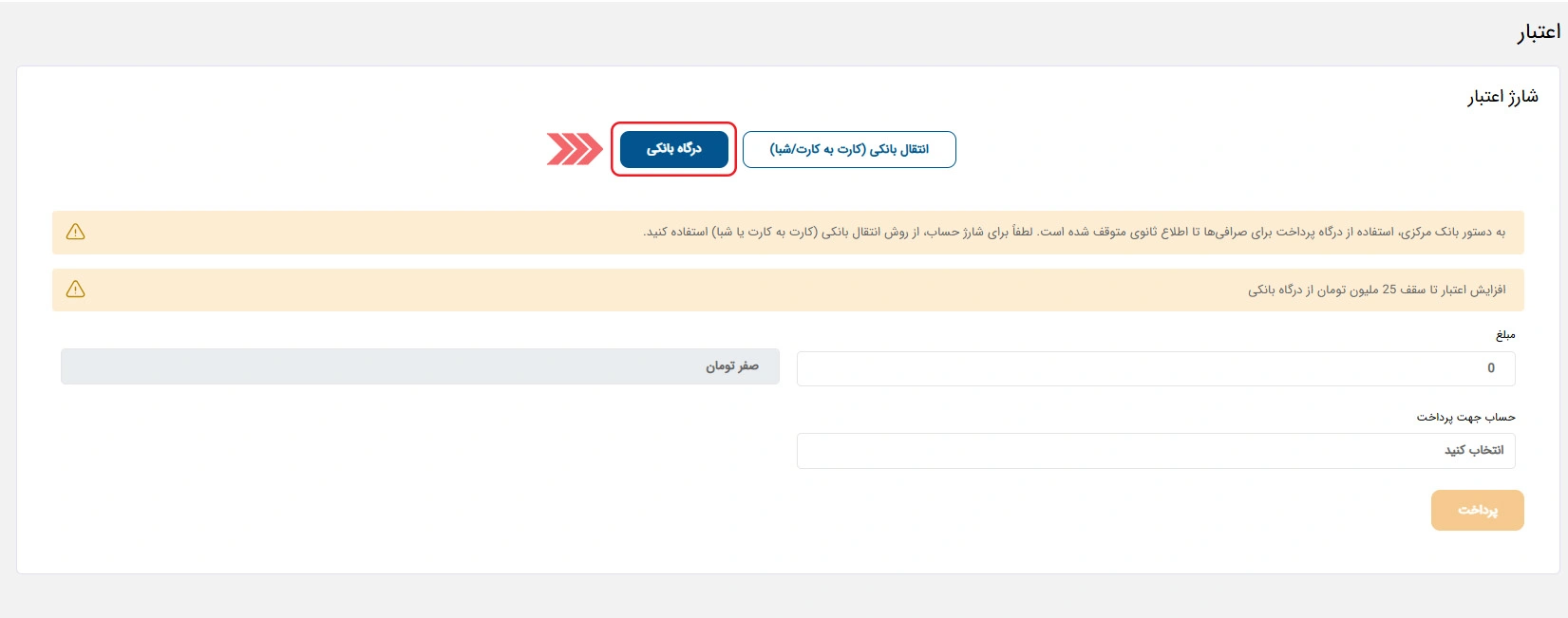 3- شارژ اعتباری از طریق درگاه تا سقف 25 میلیون تومان از هر کارت