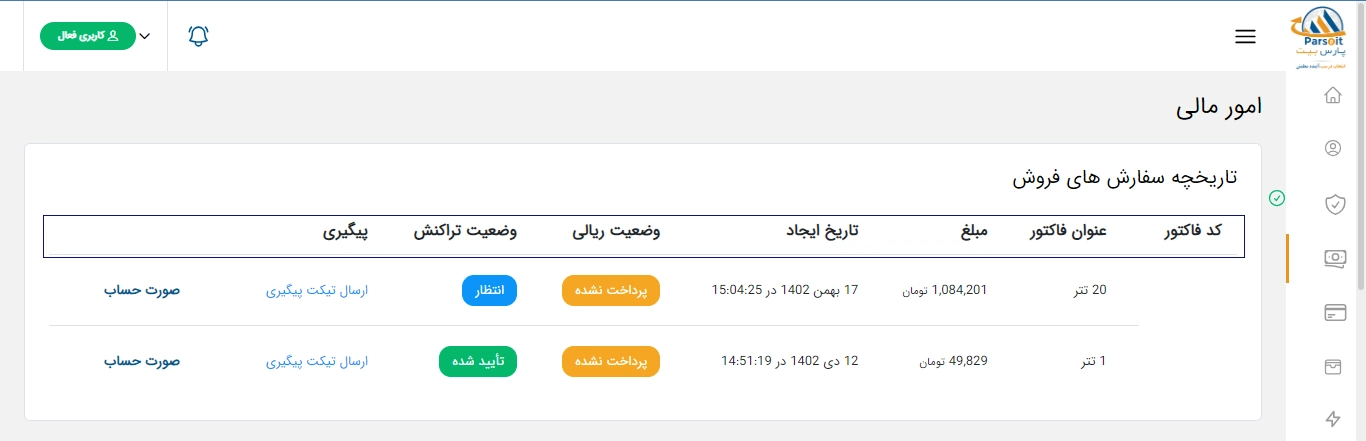 جهت پیگیری وضعیت سفارش خود به ناحیه کاربری بخش امور مالی، قسمت "تاریخچه سفارشات فروش" مراجعه نمایید. وضعیت سفارش و صورتحساب سفارش از این بخش قابل مشاهده است.