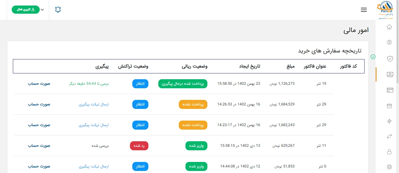 جهت پیگیری وضعیت سفارش خود به ناحیه کاربری بخش امور مالی، قسمت "تاریخچه سفارشات خرید" مراجعه نمایید. وضعیت سفارش و صورتحساب سفارش از این بخش قابل مشاهده است.