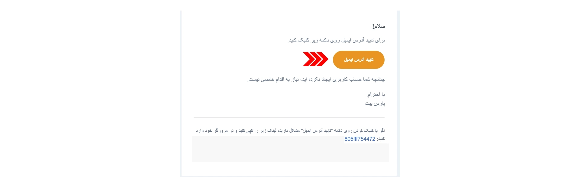 کد تایید از طرف پارس بیت به ایمیل شما ارسال شده است. کاربران گرامی توجه بفرمایید که اگر کد تاییده اولیه برای شما در قسمت Inbox ارسال نشده باشد ممکن است در قسمت spam یا promotion ارسال شده است.