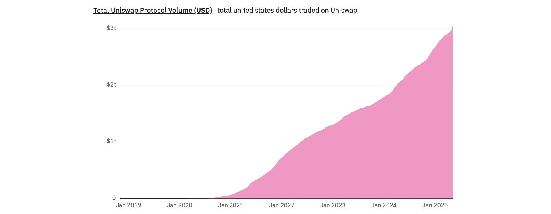 طبق دادههای پلتفرم Dune Analytics، یونی سواپ به تازگی از مرز ۳ تریلیون دلار حجم کل معاملات عبور کرده است. این رکورد توسط هیدن آدامز (Hayden Adams)، بنیانگذار یونی سواپ، در تاریخ ۱۲ مه در شبکه اجتماعی X اعلام شد.