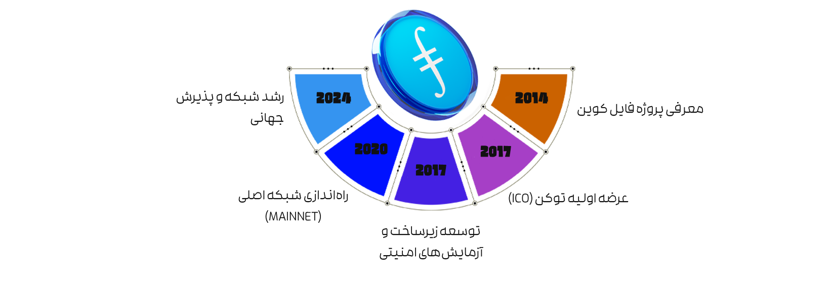 ۲۰۱۴ | معرفی پروژه فایل کوین | شرکت Protocol Labs پروژه فایل کوین را معرفی کرد؛ شرکتی که پیشتر پروژههایی مثل IPFS را توسعه داده بود. هدف ایجاد اینترنت آزادتر، مقیاسپذیرتر و کارآمدتر بود. |