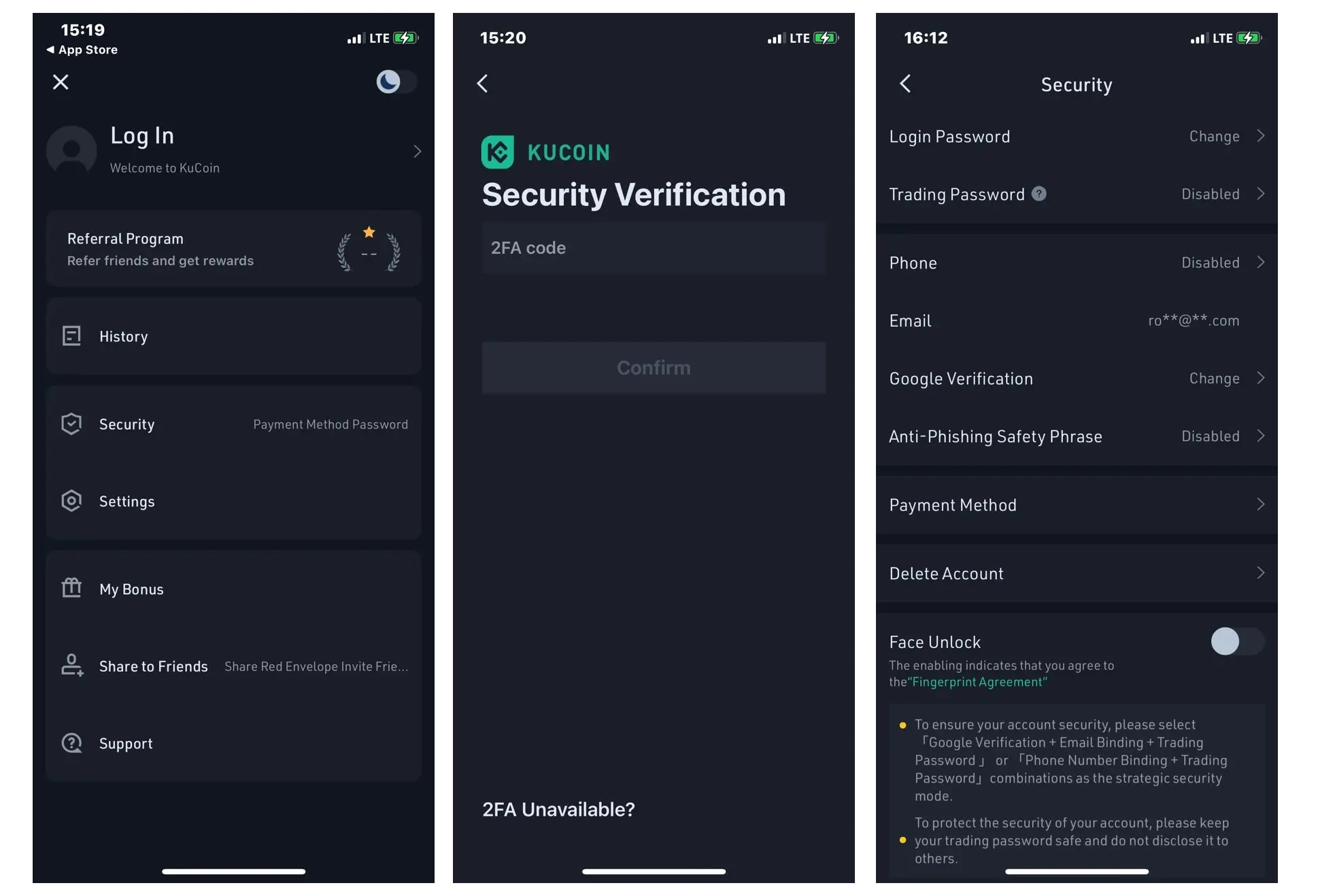 3 - اپلیکیشن صرافی کوکوین رابط کاربری آسانی دارد و تمام امکانات نسخه وب این پلتفرم در اپلیکیشن موبایلی آن هم موجود است. مثلا میتوانید به منو Security بروید و تمام تنظیمات مربوط به پسوورد معاملاتی، تایید هویت دو عاملی و KYC را آن جا ببینید.