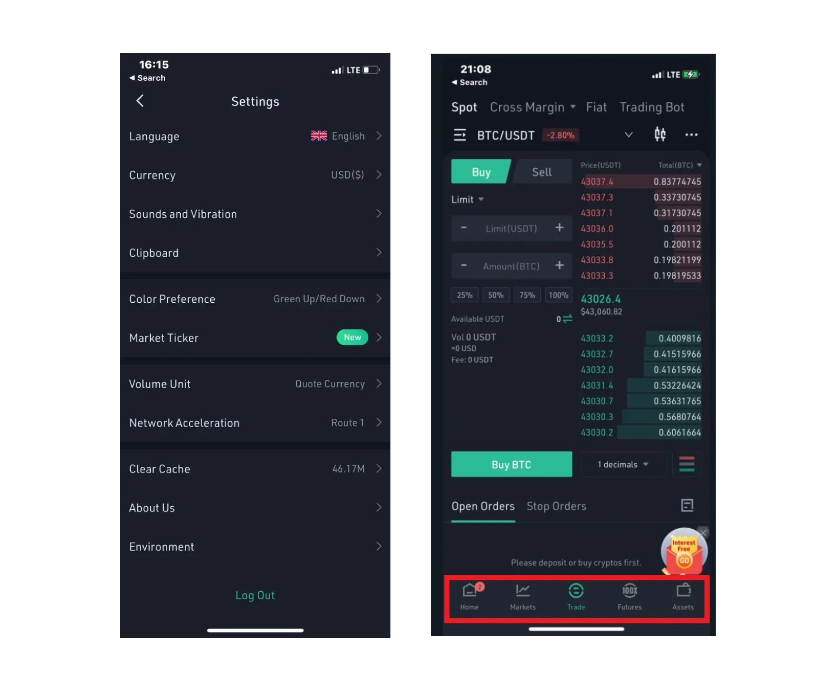 7 - همچنین، در صفحه اصلی اپلیکیشن، در سربرگهای Markets، Trade، و Futures میتوانید به بخشهای مربوط به بازار رمز ارزها دسترسی داشته باشید و در قسمت Assets نیز داراییهای خود در این صرافی را مشاهده کنید.