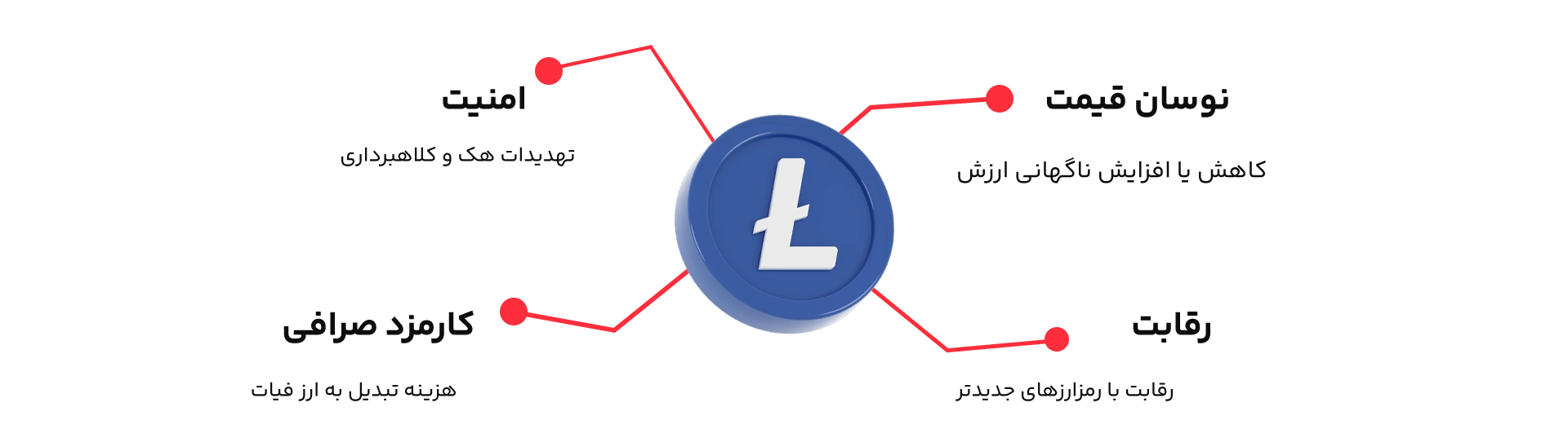 با وجود مزایای زیاد، لایت کوین (LTC) نیز با چالشهایی مواجه است. نوسانات قیمت یکی از اصلیترین ریسکها برای سرمایهگذاران است. همچنین، رقابت با رمزارزهای جدیدتر و با فناوری پیشرفتهتر میتواند جذابیت آن را کاهش دهد. مشکلات امنیتی، اگرچه کم است، اما همیشه برای کاربران و ماینرها وجود دارد. از سوی دیگر، برخی صرافیها کارمزدهای بالایی برای تبدیل لایت کوین به ارز فیات دریافت میکنند. جدول زیر معایب و ریسکهای کلیدی لایت کوین را نشان میدهد: