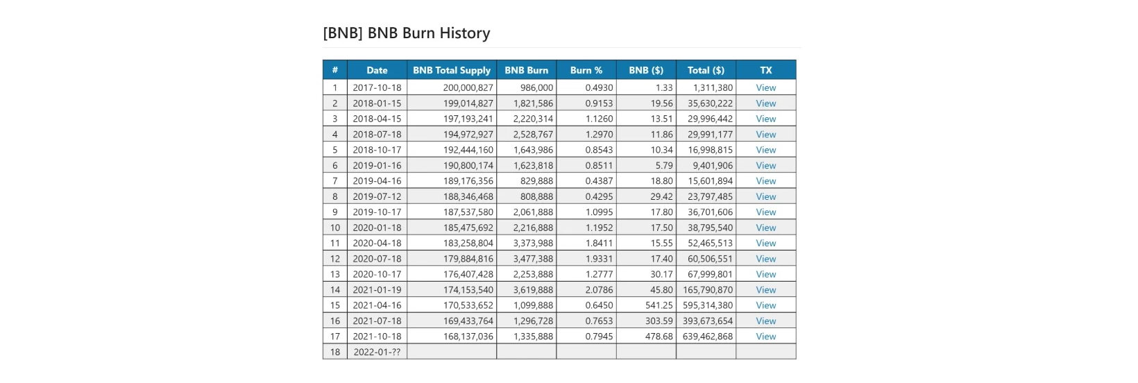 زمان این توکن سوزی هر سه ماه یک بار اتفاق می افتد. طبق توضیحات سایت اصلی صرافی بایننس اخرین توکن سوزی در تاریخ 17 ژانویه 2023 یعنی بیست و هفتم دیماه 1402 صورت گرفت که طی آن 2,064,494.32 بایننس کوین سوزانده شده است. این توکن سوزی فصلی تا زمانی ادامه دارد که ۱۰۰ میلیون BNB نیمی از کل عرضه از چرخه خارج شوند.